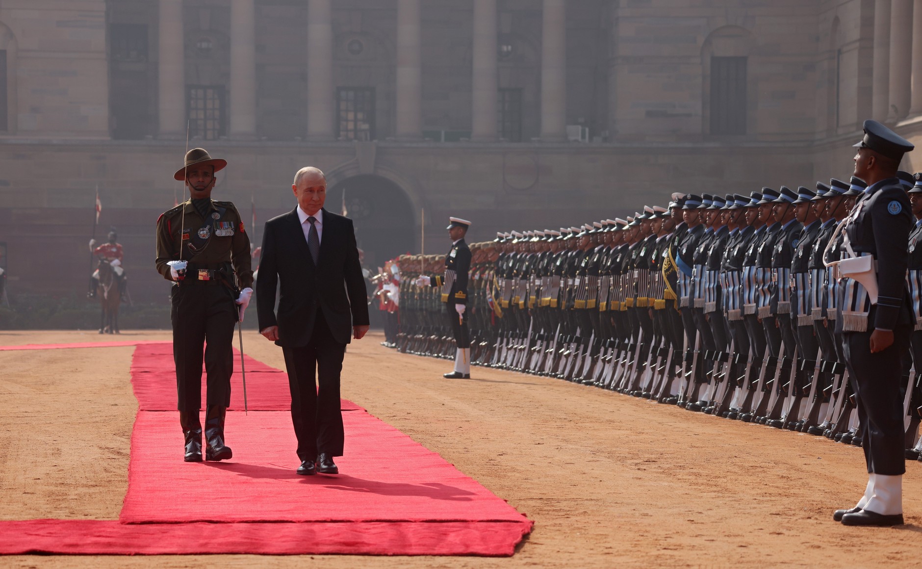이튿날인 12월 5일 오전, 장소는 인도의 심장부 대통령 궁 ‘라슈트라파티 바반(Rashtrapati Bhavan)’의 앞마당으로 바뀌었다. 이곳에서 펼쳐진 의전은 그야말로 압도적인 장관이었다. ‘라슈트라파티 바반’은 단순한 관저가 아니다. 뉴델리 중심부인 라이시나 언덕 정상에 우뚝 솟아있는 세계 최대 규모의 국가원수 거주지 중 하나다. 원래 이곳은 1911년 영국이 식민 통치를 위해 지었던 총독 관저, 즉 제국주의의 심장부였다. 하지만 1950년 인도가 공화국이 되면서 이곳은 세계 최대 민주국가의 수반이 머무는 공간으로 다시 태어났다. 즉, 라슈트라파티 바반은 인도의 긍지이자 살아있는 역사 박물관이다.