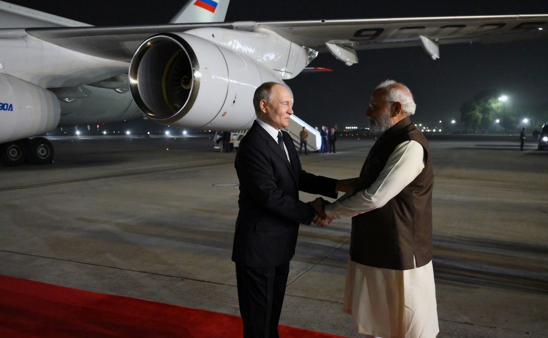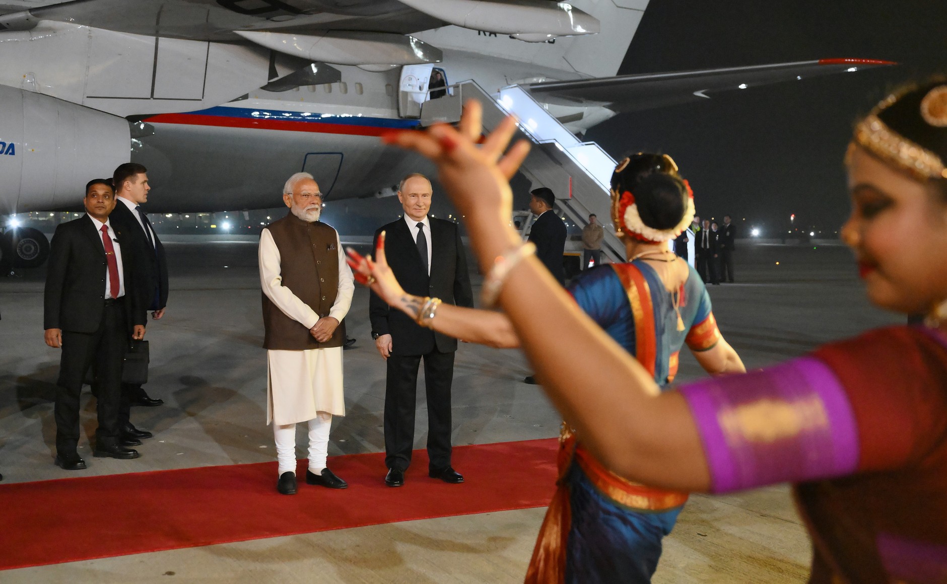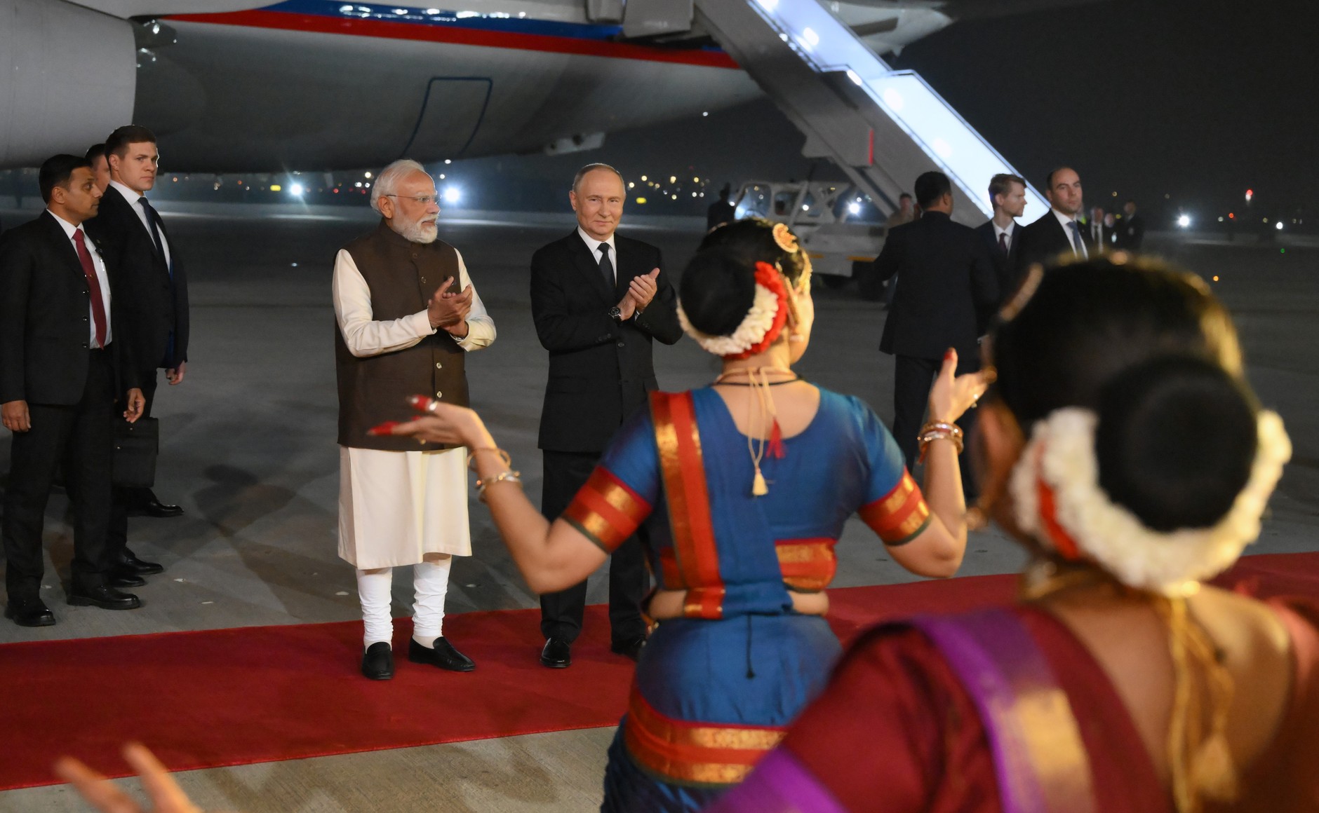 12월 4일 저녁, 모디 총리는 관례를 깨고 팔람 공군기지의 활주로까지 직접 마중을 나갔다. 트랩에서 내린 푸틴과 모디가 나눈 이른바 ‘곰 포옹(Bear Hug)’은 이번 방문 성격을 상징적으로 보여준다.