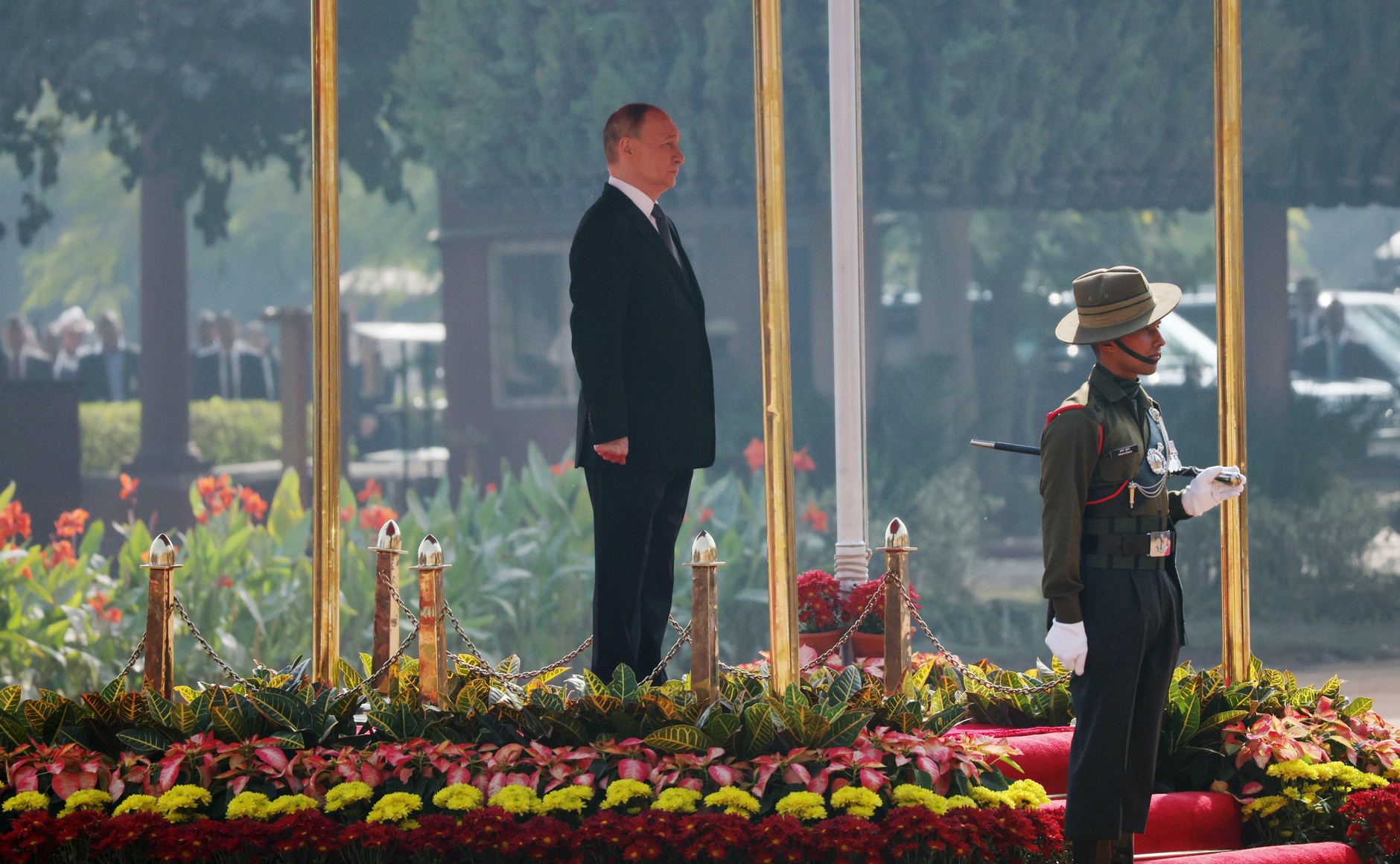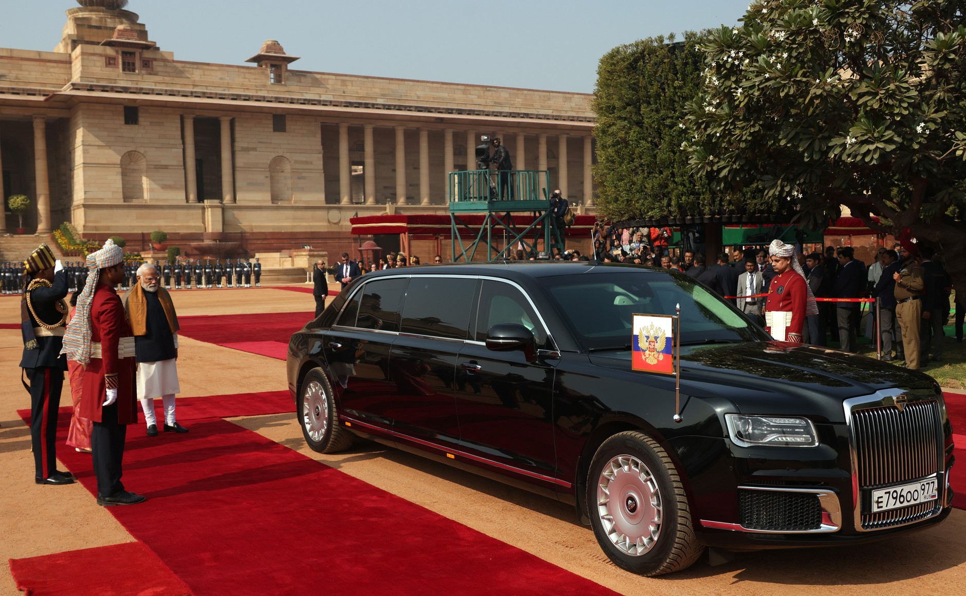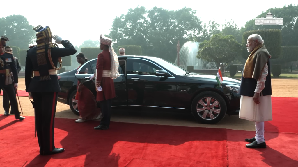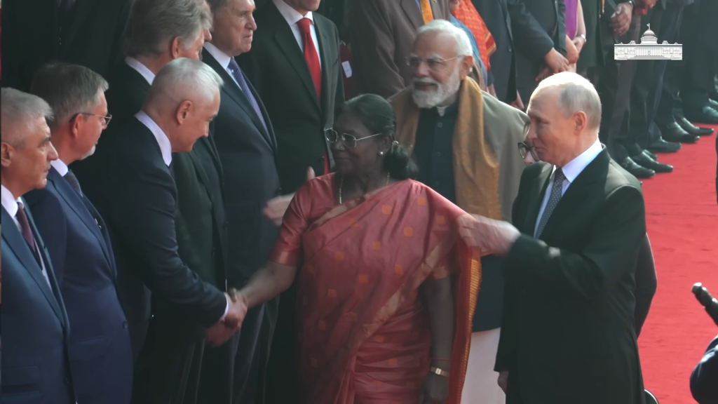 푸틴 대통령을 맞이하는 이 장면에는 인도의 역동적인 사회상이 녹아있다. 의전 행사가 끝나고 무르무 대통령은 동행한 러시아 각료들과 일일이 악수를 나누었다. 이때도 모디 총리는 무르무 대통령의 뒤를 따르며 수행하는 모습을 보여, 헌법상 총리의 의전 서열이 대통령보다 낮음을 다시 한번 확인시켰다.