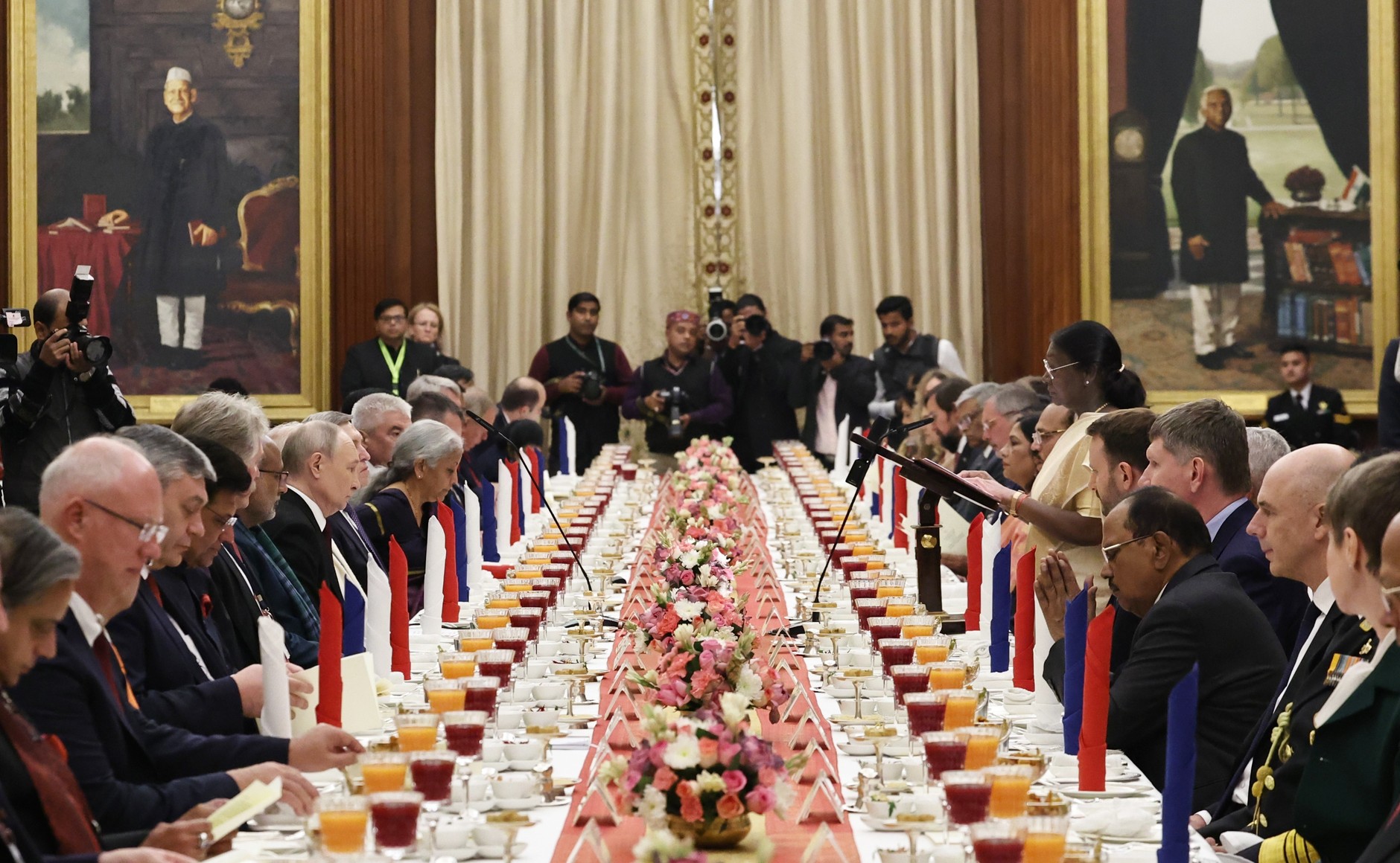 저녁, 푸틴 대통령은 다시 대통령궁으로 돌아와 드라우파디 무르무 대통령이 주최한 국빈 만찬에 참석했다. 이 만찬은 공식 방문 일정의 화려한 정점이자 국가 원수가 주최하는 최고의 국가적 예우를 상징했다. 푸틴 대통령은 대통령 앞 상석에 착석했고, 양국 주요 관리들이 함께 배석한 가운데 무르무 대통령과 푸틴 대통령은 양국 우호와 건강 기원을 위한 공식 건배를 나누었다. 이 국빈 만찬은 푸틴의 방문이 인도 국가 차원에서 공식적이고 격조 높은 환대를 받았다는 것을 전 세계에 확인시켜주는 절차였다.