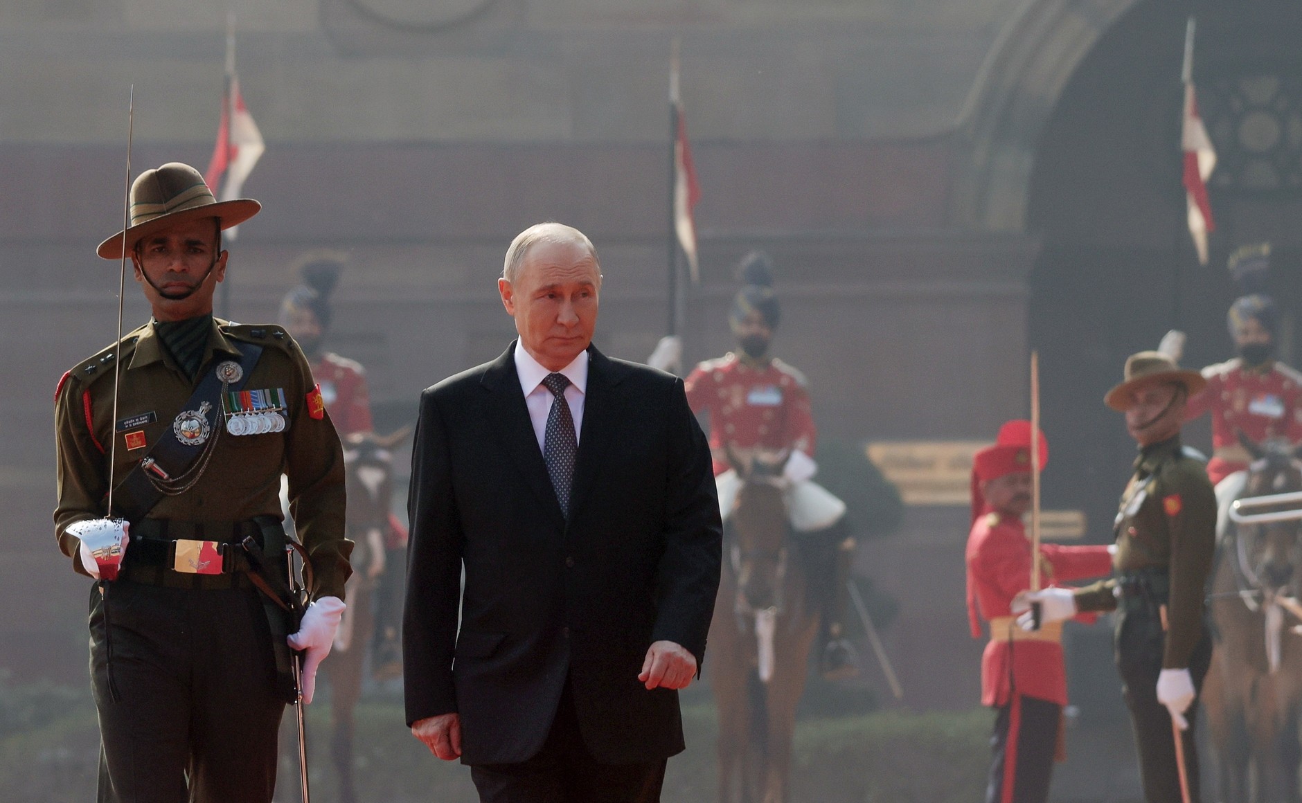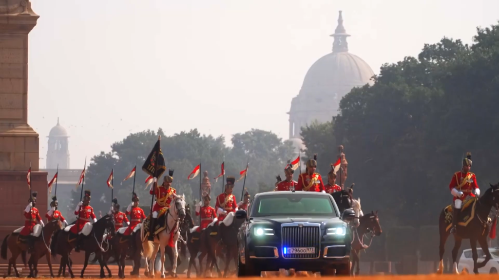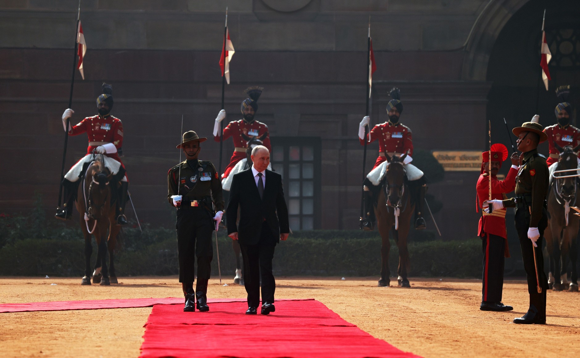 이 역사적인 무대 위로 푸틴 대통령의 전용차량이 들어오자 인도의 최정예 기마부대인 ‘대통령 경호대(PBG)’가 호위를 시작했다. 화려한 제복을 입은 기마병들이 말발굽 소리를 울리며 차량을 에워쌌고, 광장까지 웅장하게 에스코트하는 모습은 인도가 보여줄 수 있는 최고의 격식이었다. 특히 전원 키 183센티미터 이상의 정예 병사들로 구성된 기마병들은 화려한 붉은 제복에 터번을 착용하고, 윤기 흐르는 갈색 말을 탄 채 창을 들고 도열했다. 이 웅장한 모습은 다른 나라에서는 볼 수 없는 인도 의전만의 백미다.