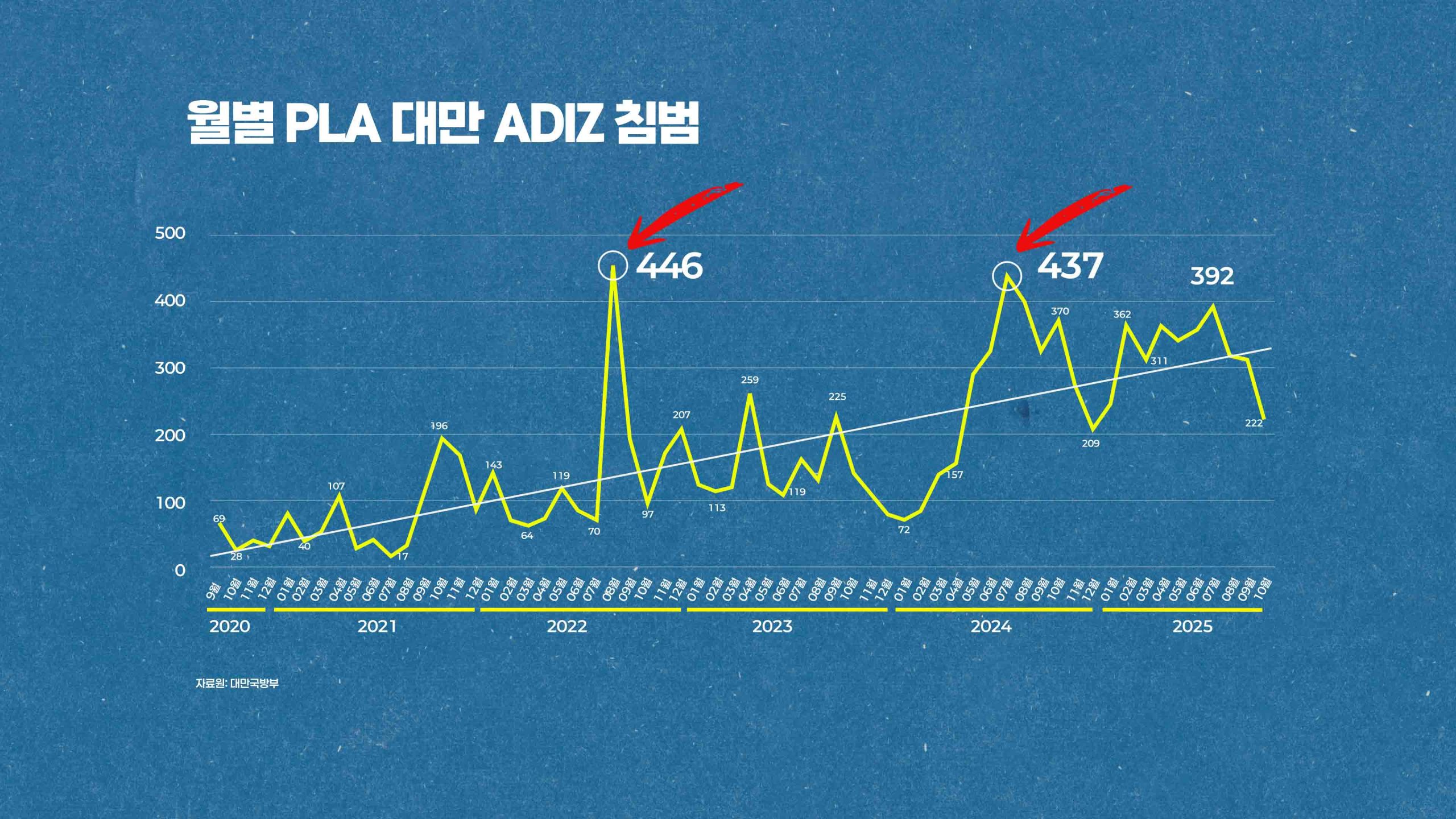 두 번의 폭발적 급증: 그래프 상에는 두 개의 거대한 봉우리가 관측된다. 첫 번째는 2022년 8월 펠로시 방문 직후로 월 446회라는 역대 최고치를 기록했다. 두 번째는 2024년 5월 라이칭더 총통 취임 직후로, 월 437회까지 다시 폭증했다.