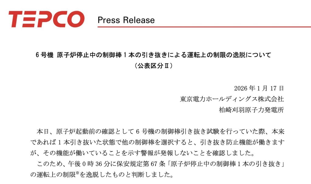 NHK 등 현지 언론에 따르면, 도쿄전력은 원자로의 출력을 조절하는 ‘제어봉’을 뽑아내는 시험을 진행하던 중, 특정 상황에서 반드시 울려야 할 경보가 작동하지 않는 문제를 확인했다. 제어봉은 원자로 내 핵분열 속도를 제어하는 핵심 설비로, 이와 관련된 장치의 오작동은 심각한 안전 문제로 이어질 수 있다.