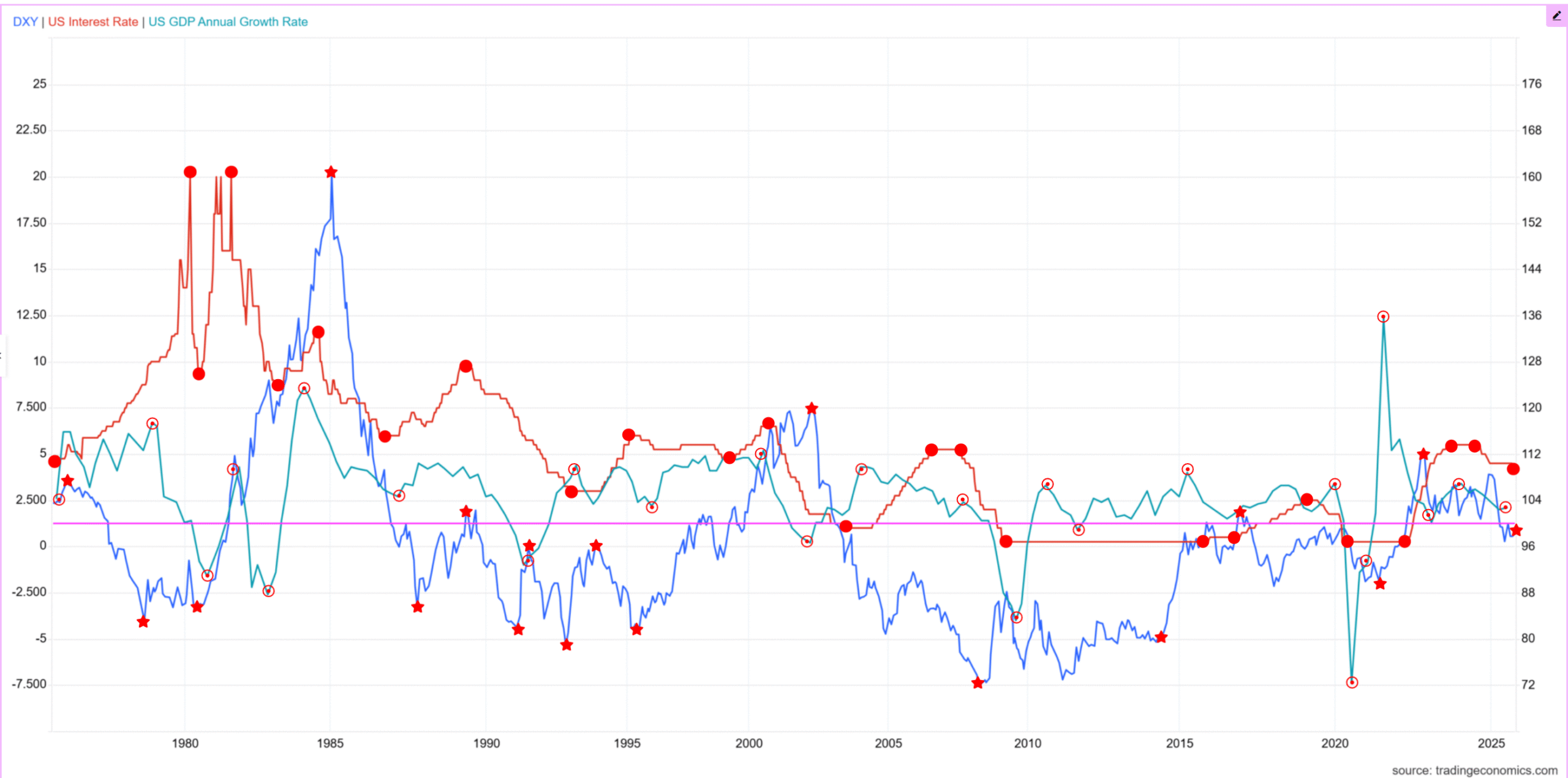 달러 인덱스 vs 미국 이자율 vs GDP 성장율(YoY) 1975년 12월 기준금리 4.88% 1980년 3월 기준금리 20% 1980년6월 9.5% 1981.5 20% 1983년6월 8.5% …