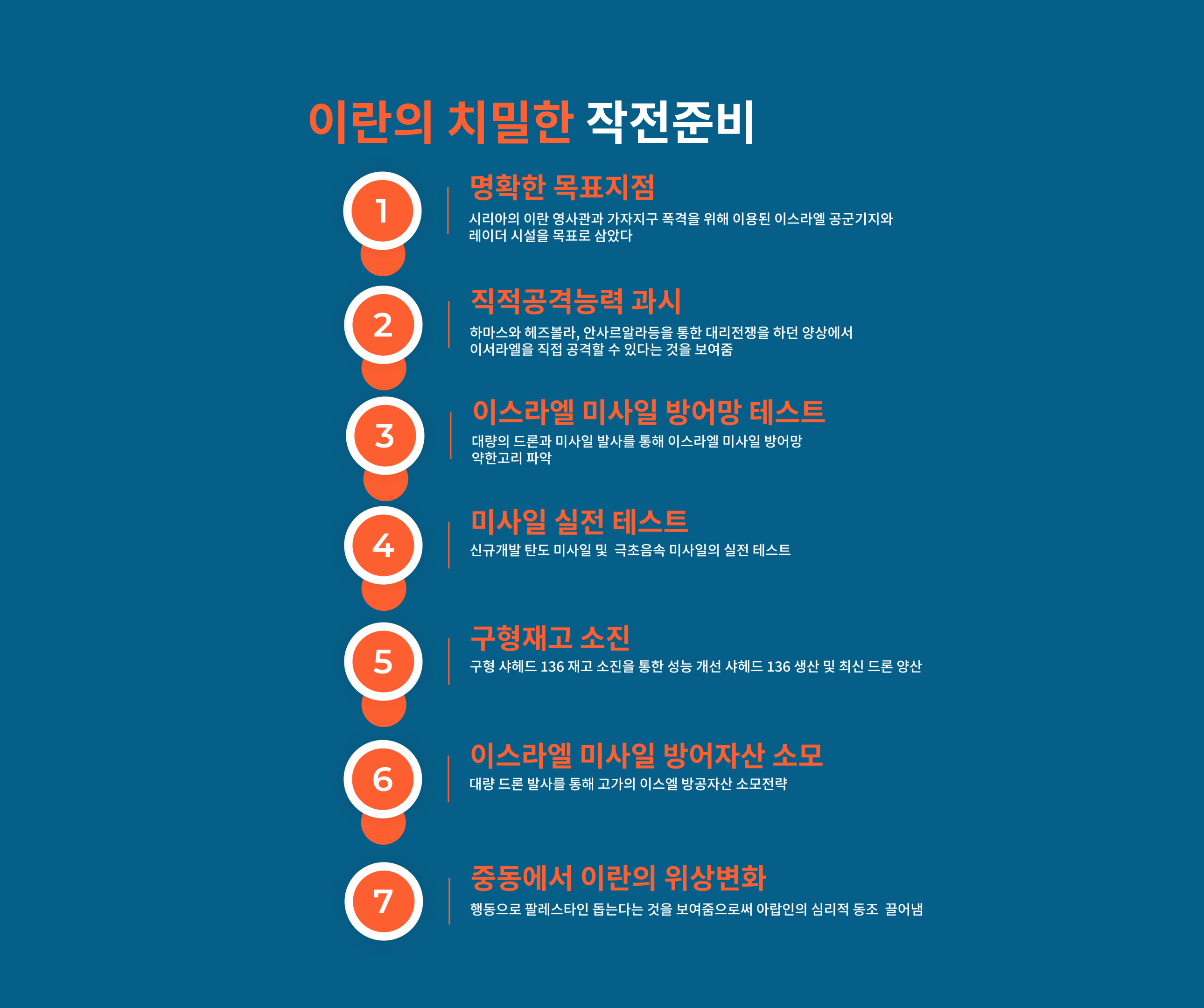 이란은 그동안 오랫동안의 전략적 인내를 마치고 이스라엘에 대하여 2번을 직접 공격했다. 이란은 미국과의 전쟁을 염두에 두고 그동안 준비를 해 왔다. 이 두 번의 미사일 발사로 직접 공격 능력을 과시했으며, 구형 미사일과 드론 재고를 소진했다. 한편으로 이스라엘의 미사일 방어망의 강약 점을 파악했을 뿐 아니라 미사일 실전 테스트를 했다.
