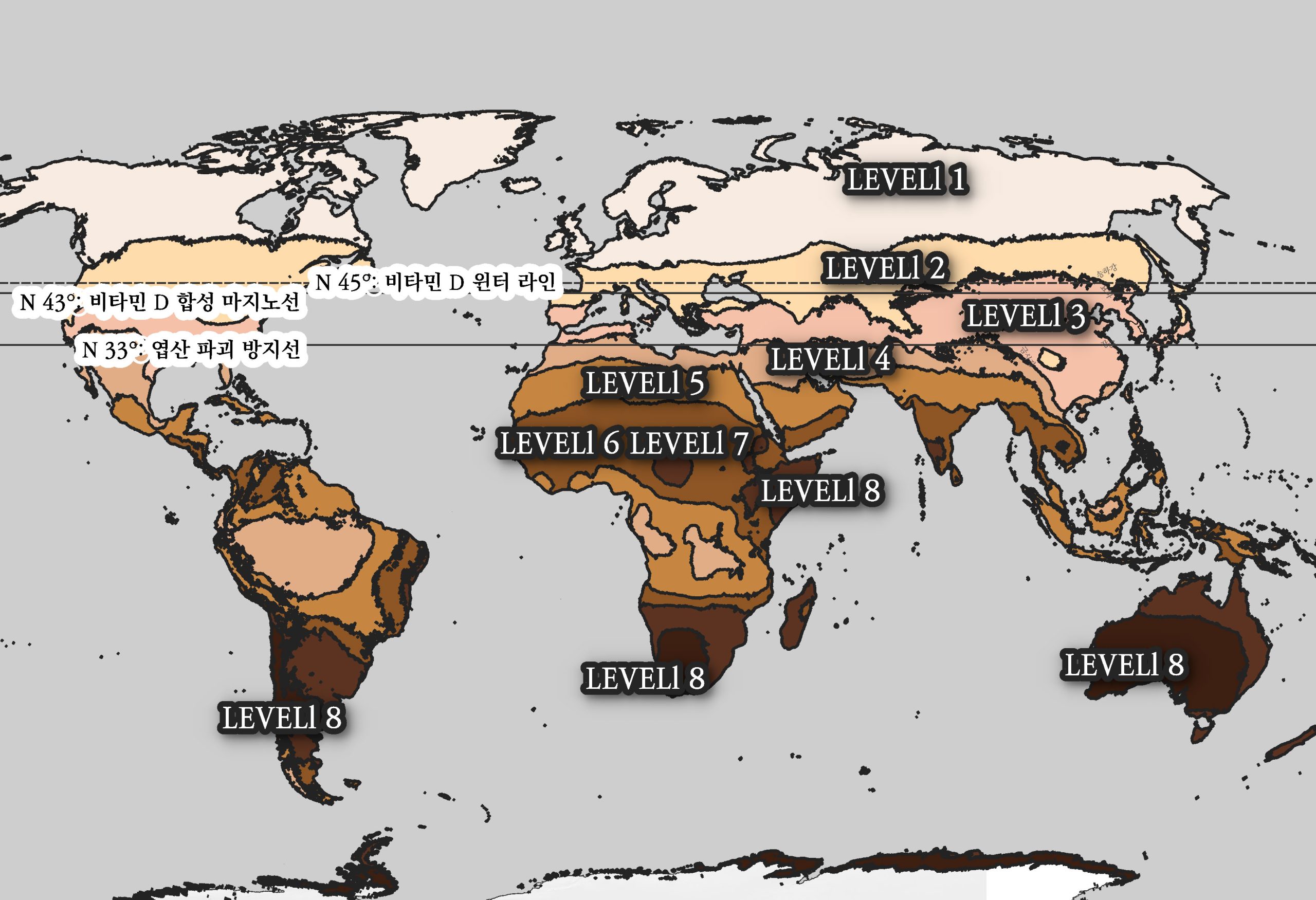 반면 고위도 지역인 레벨 1에서 2 사이의 터로 갈수록 일조량이 부족해진다. 이곳은 비타민 D 합성이 어려운 환경이기에, 인류는 멜라닌이라는 방패를 포기하고 피부를 최대한 투명하게 만드는 방향을 선택했다. 단 한 줌의 햇빛이라도 더 받아들여 비타민 D를 합성하기 위한 진화적 선택이다.